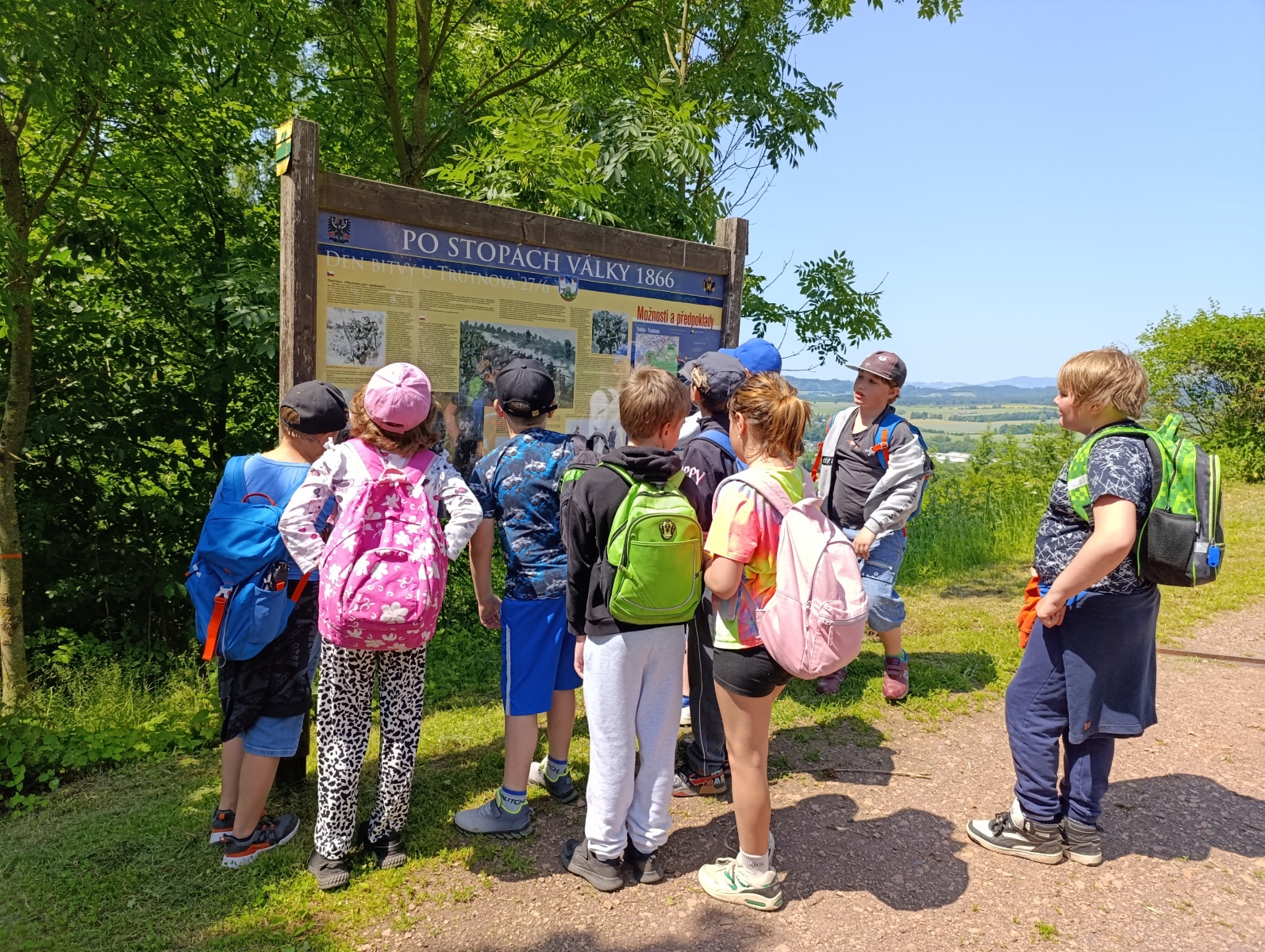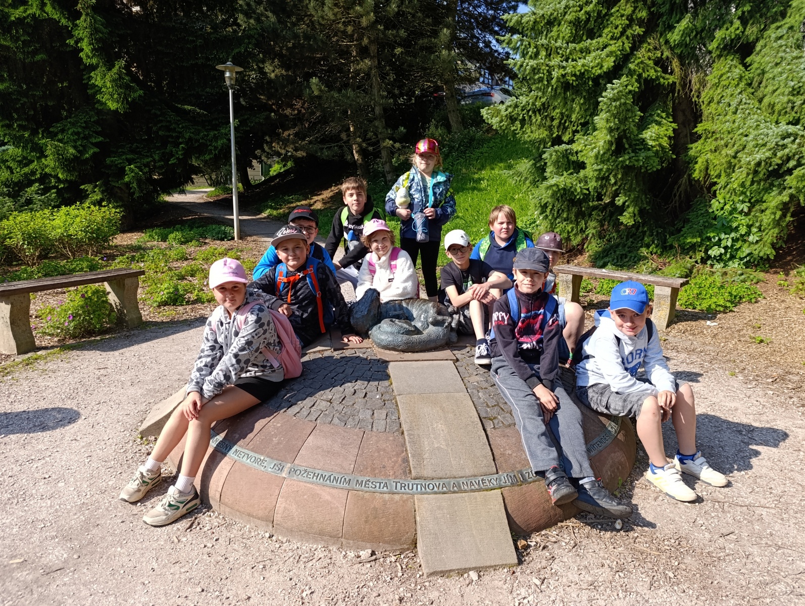 Naše putování pokračovalo na Krakonošovo náměstí - prohlédli jsme si Starou radnici, Haasův palác, Krakonošovu kašnu, Sloup Nejsvětější Trojice i desku, připomínající události z června roku 1866. Odtud jsme zamířili do městského parku, kde jsem obdivovali sochu draka, která v minulosti zdobila kašnu přímo na náměstí. Ještě nás čekala malebná Jánská kaple a pak už vrchol dnešní procházky – Památník generála Gablenze. Je to místo úzce spojené s bitvou u Trutnova z roku 1866. Co bylo ale největší zážitek? Že jsme si památník mohli prohlédnout i uvnitř! Z okolí památníku se nám naskytl nádherný výhled na celý Trutnov i majestátní Krkonoše.