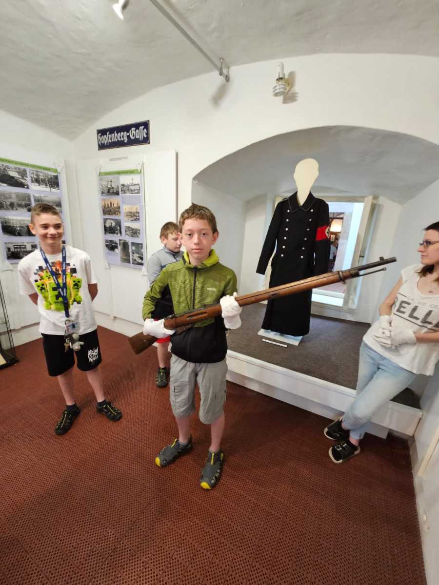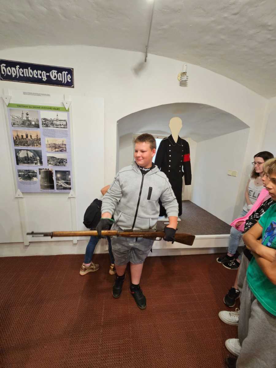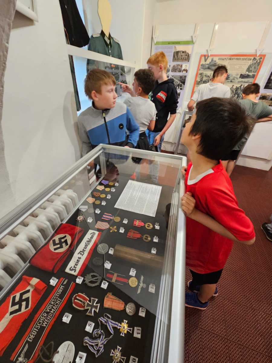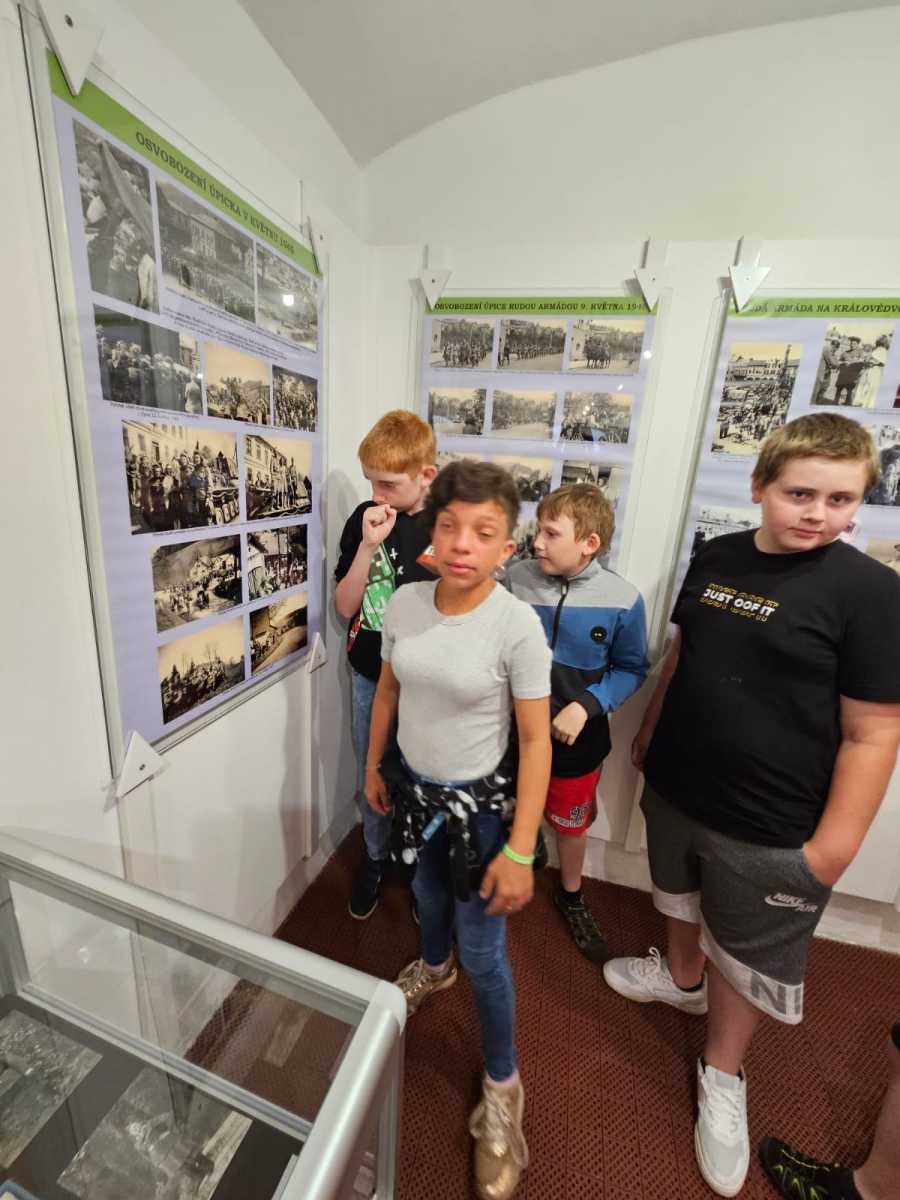 Poslední školní pondělí před letními prázdninami vyrazili čtvrťáci a páťáci na tajný výlet. Čekala na ně prohlídka výstavy V soukolí druhé světové války v Muzeu Podkrkonoší. Páťáci už ve vlastivědě tohle téma probírali a čtvrťákům se načerpané poznatky budou hodit v příštím roce. Po celý den provázely výletníky rozmary počasí. Déšť jim ale nezkazil náladu ani návštěvu cukrárny, kde si každý pochutnal na své oblíbené zmrzlině.