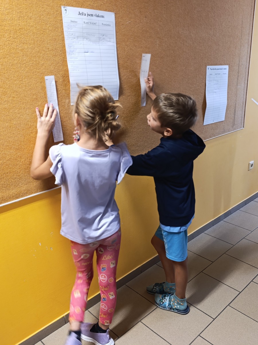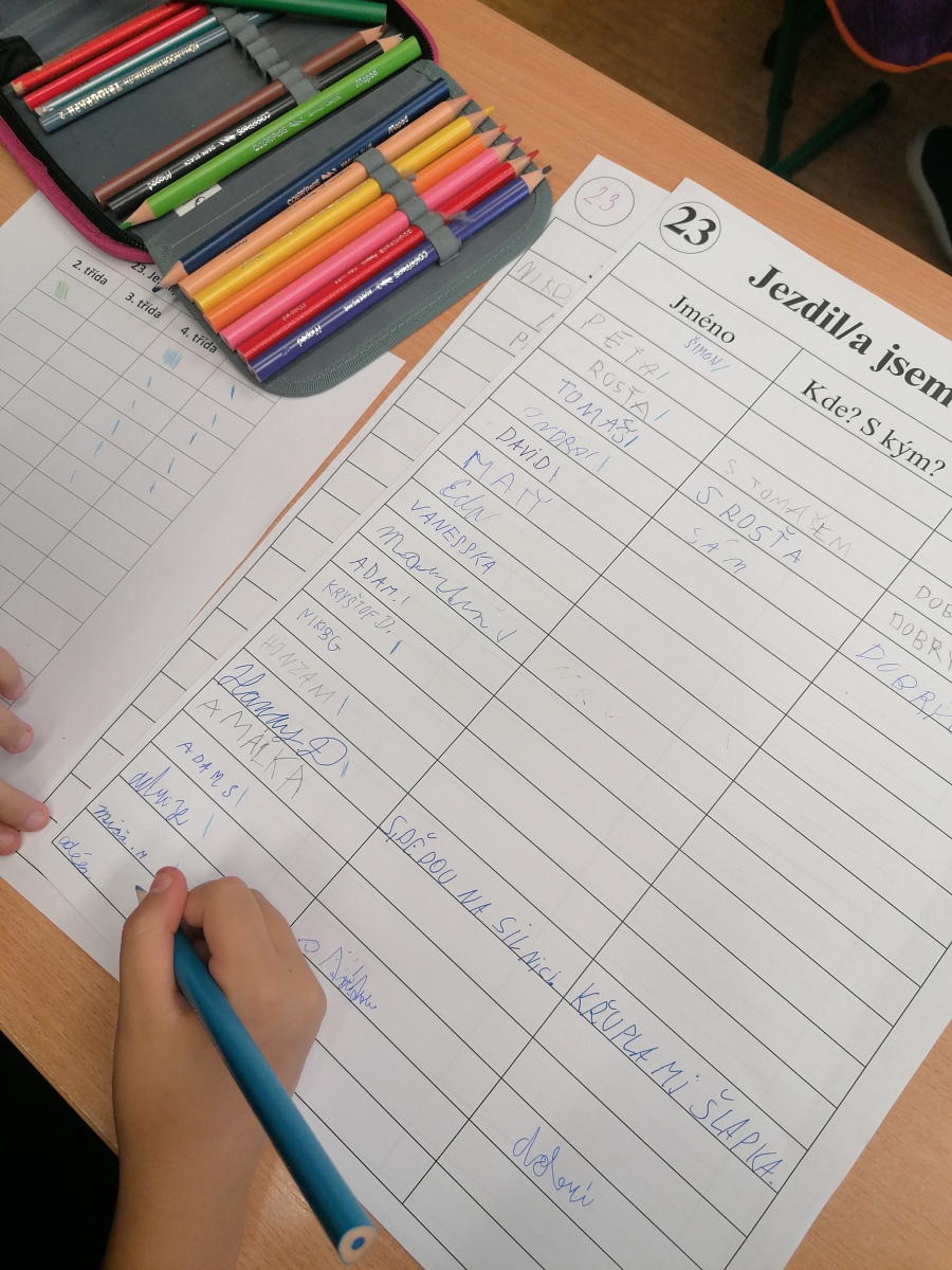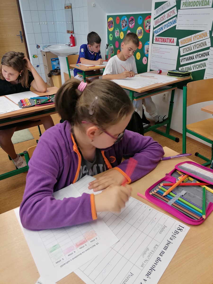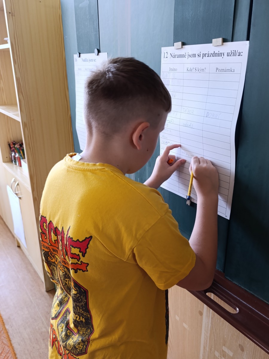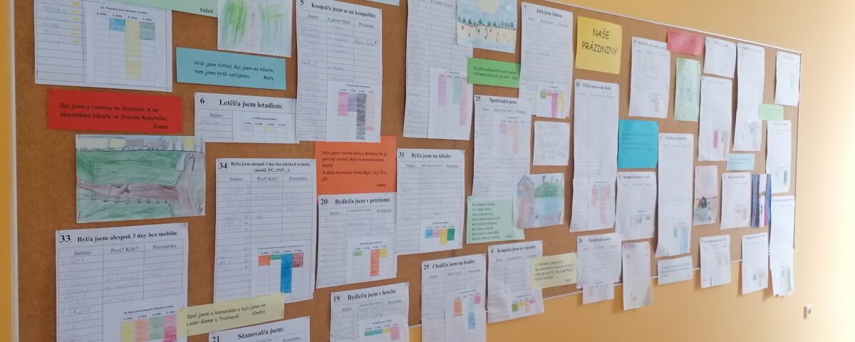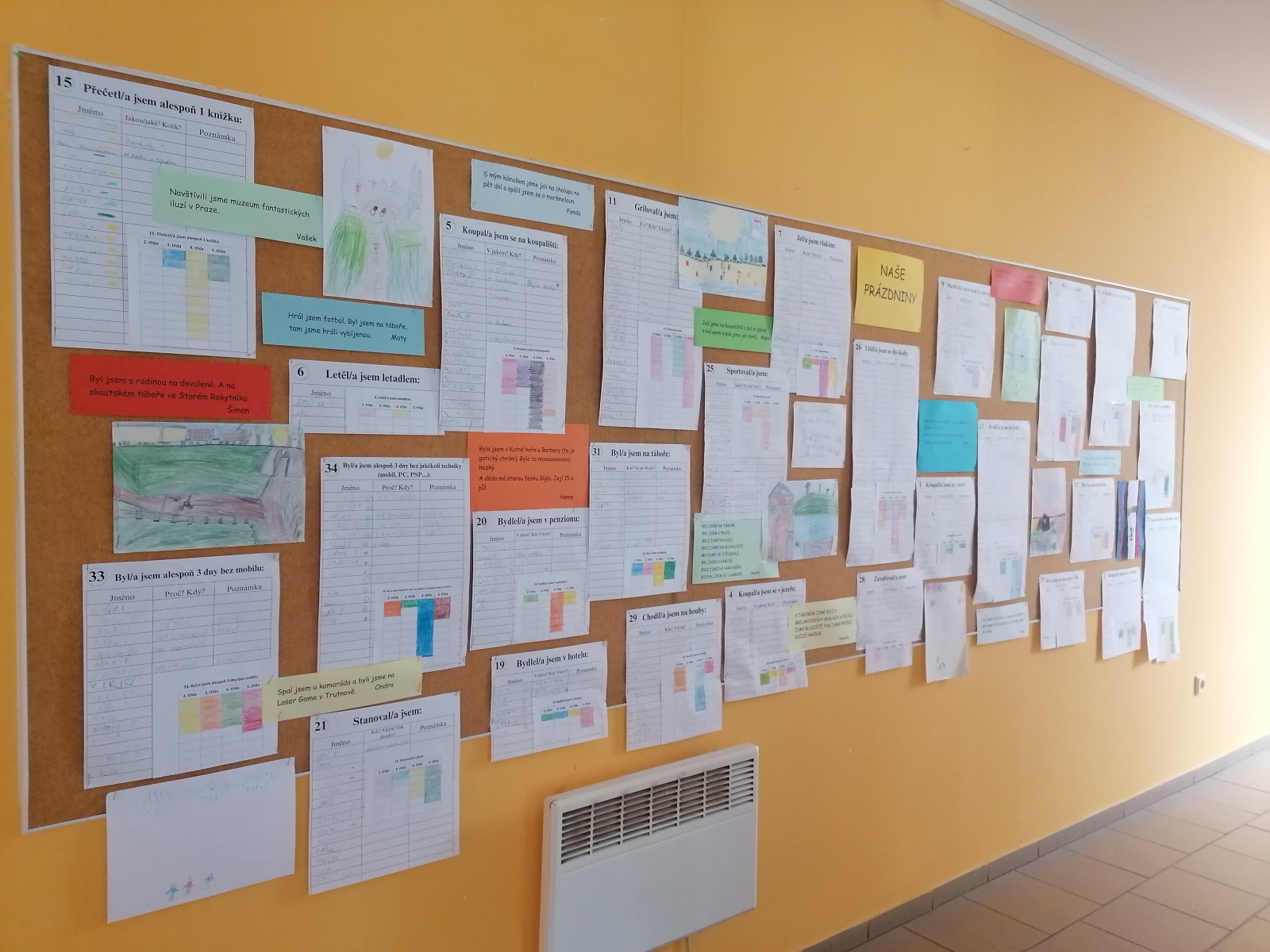 Druhý školní den se děti z 2. až 5. třídy ohlédly za svými letními prázdninami. Písemně odpovídaly na připravené otázky a při tom se pohybovaly po chodbě i ve třídách. Na závěr z nasbíraných odpovědí společně vytvořily barevné grafy. Někteří žáci své zážitky ilustrovali obrázky, jiní je vyjádřili krátkými texty. Všechny práce se nakonec proměnily v pestrou nástěnku na školní chodbě. Celé dopoledne probíhalo v klidné a tvořivé atmosféře a bylo vidět, že děti tato aktivita velmi zaujala.