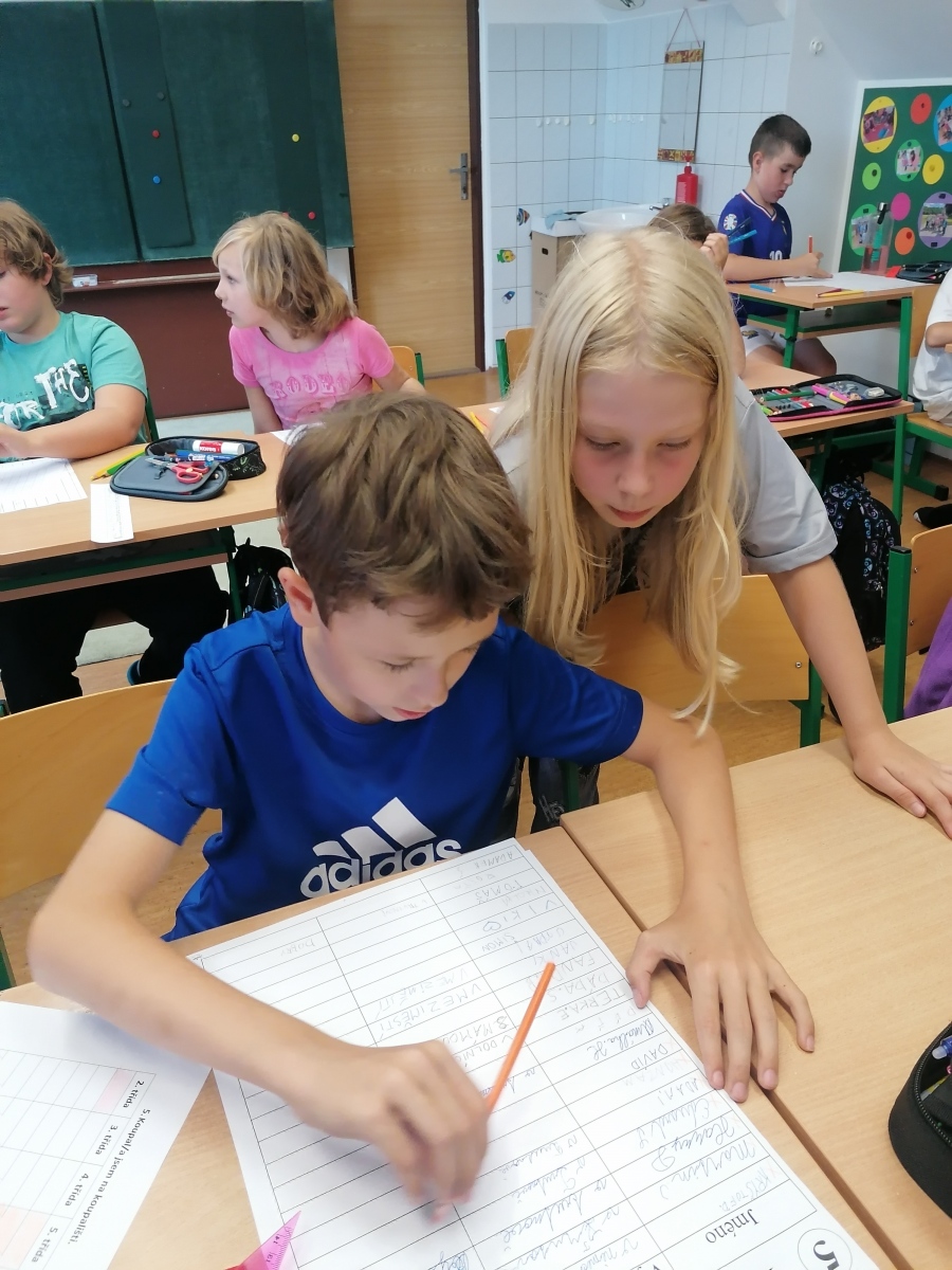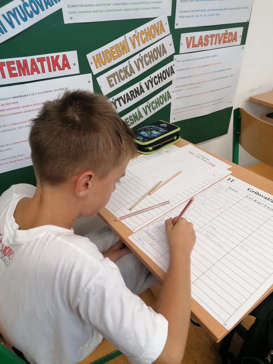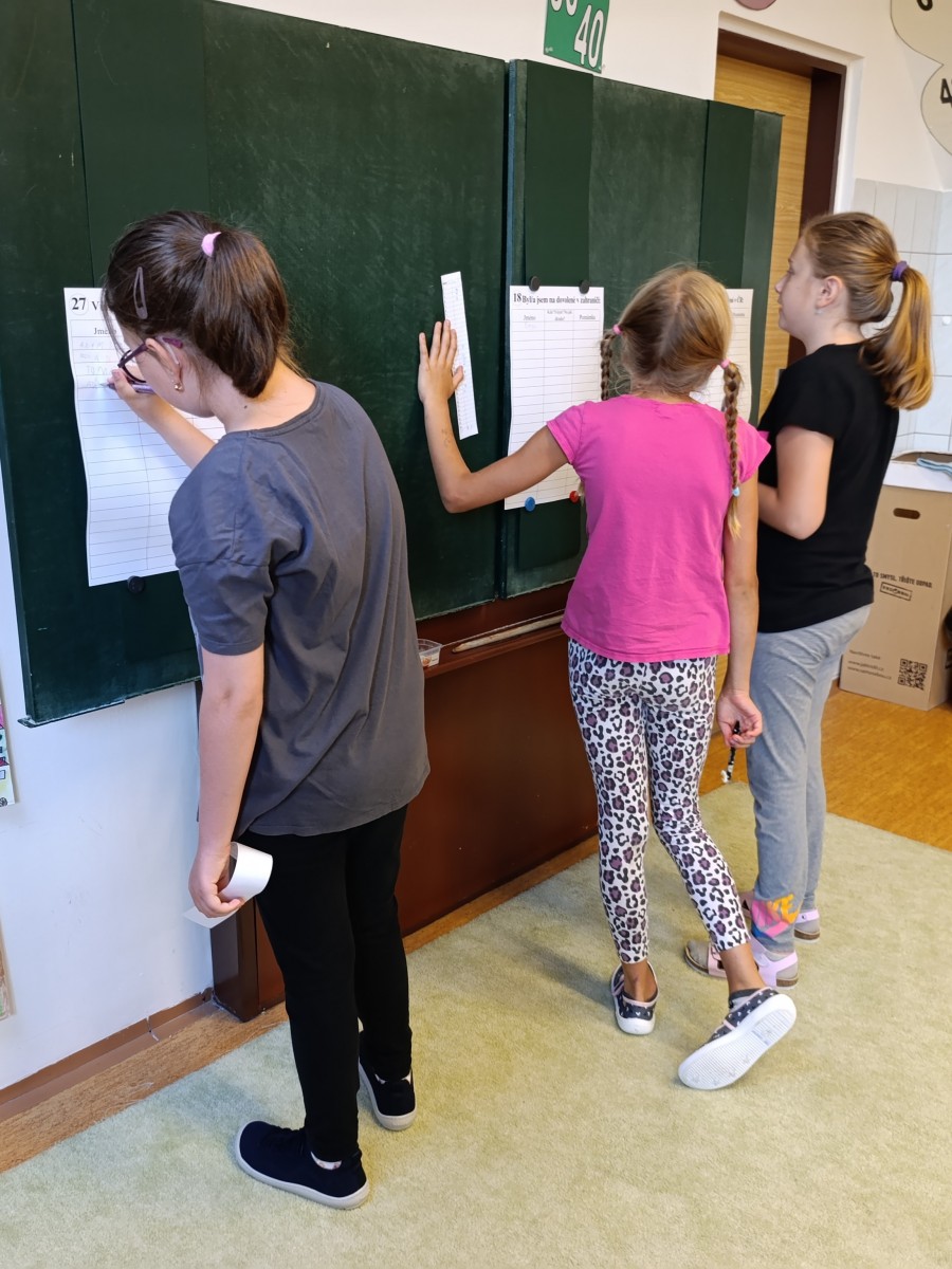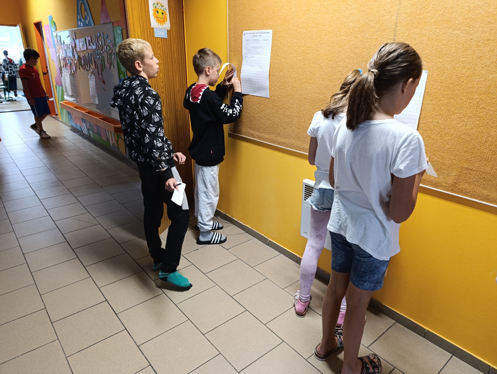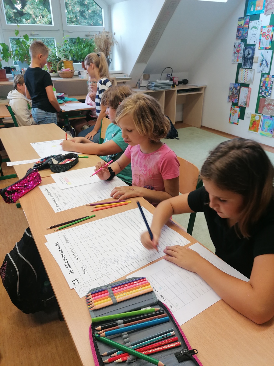 Druhý školní den se děti z 2. až 5. třídy ohlédly za svými letními prázdninami. Písemně odpovídaly na připravené otázky a při tom se pohybovaly po chodbě i ve třídách. Na závěr z nasbíraných odpovědí společně vytvořily barevné grafy. Někteří žáci své zážitky ilustrovali obrázky, jiní je vyjádřili krátkými texty. Všechny práce se nakonec proměnily v pestrou nástěnku na školní chodbě. Celé dopoledne probíhalo v klidné a tvořivé atmosféře a bylo vidět, že děti tato aktivita velmi zaujala.