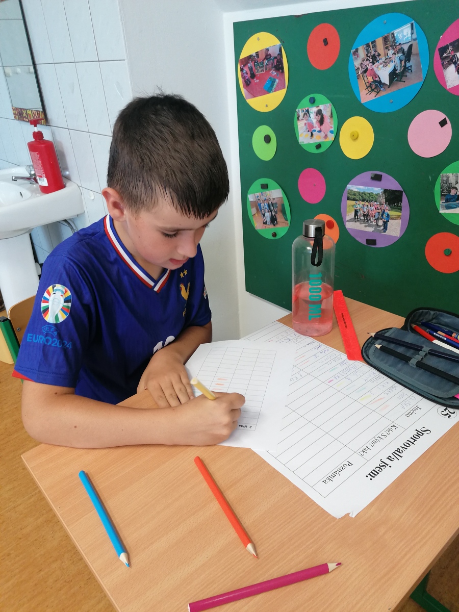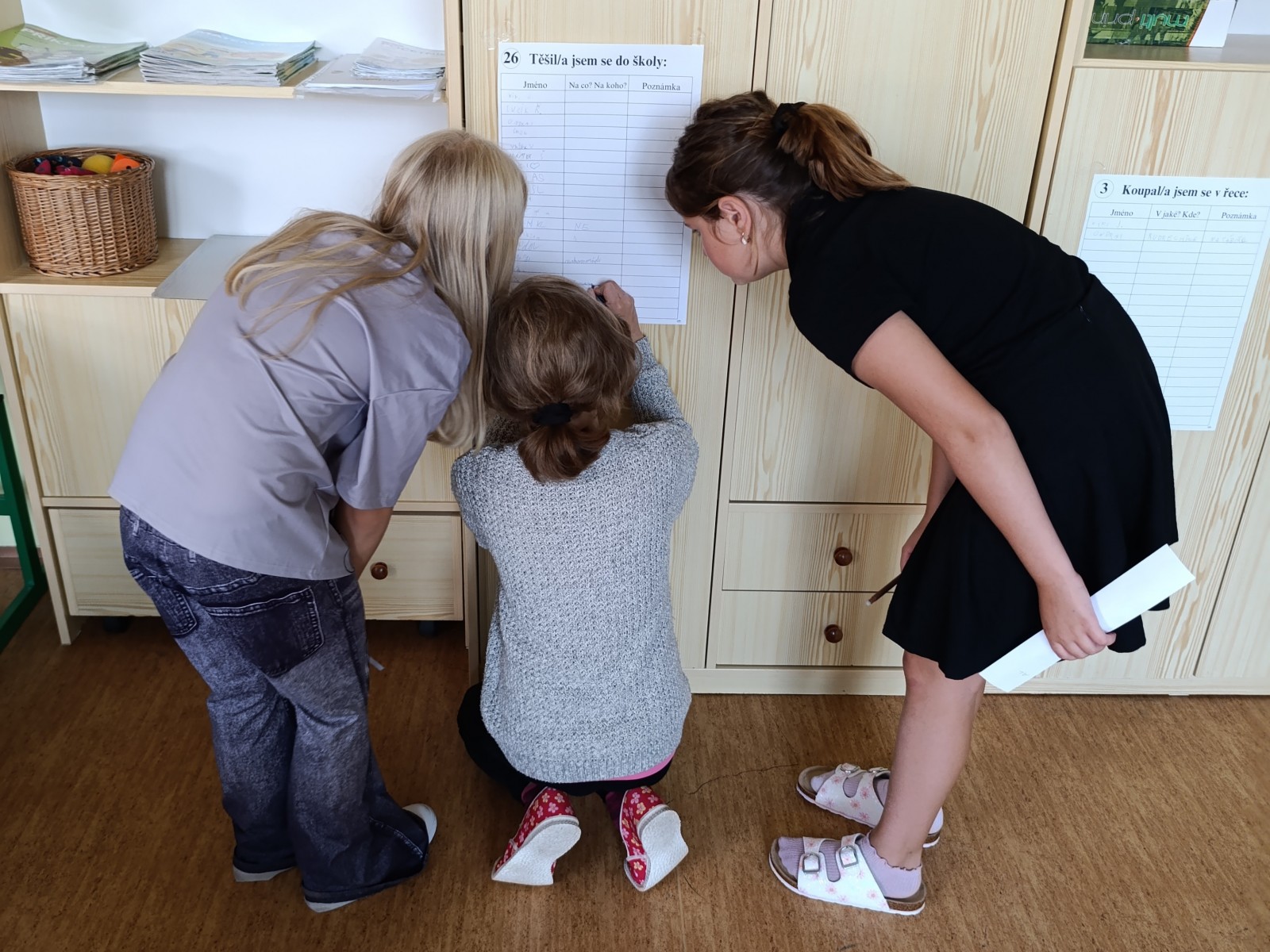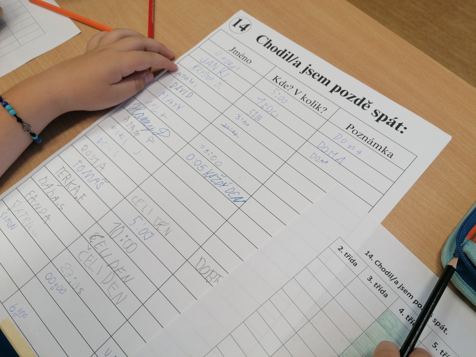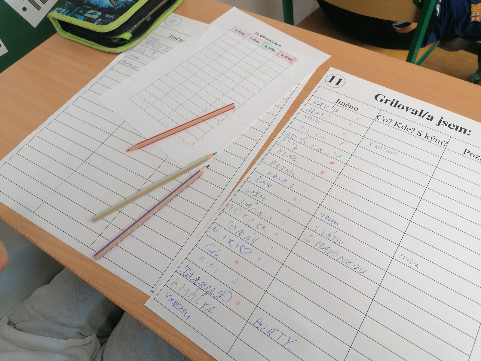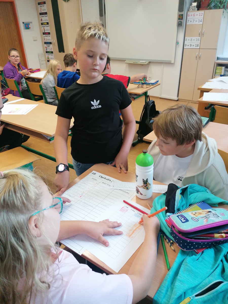 Druhý školní den se děti z 2. až 5. třídy ohlédly za svými letními prázdninami. Písemně odpovídaly na připravené otázky a při tom se pohybovaly po chodbě i ve třídách. Na závěr z nasbíraných odpovědí společně vytvořily barevné grafy. Někteří žáci své zážitky ilustrovali obrázky, jiní je vyjádřili krátkými texty. Všechny práce se nakonec proměnily v pestrou nástěnku na školní chodbě. Celé dopoledne probíhalo v klidné a tvořivé atmosféře a bylo vidět, že děti tato aktivita velmi zaujala.