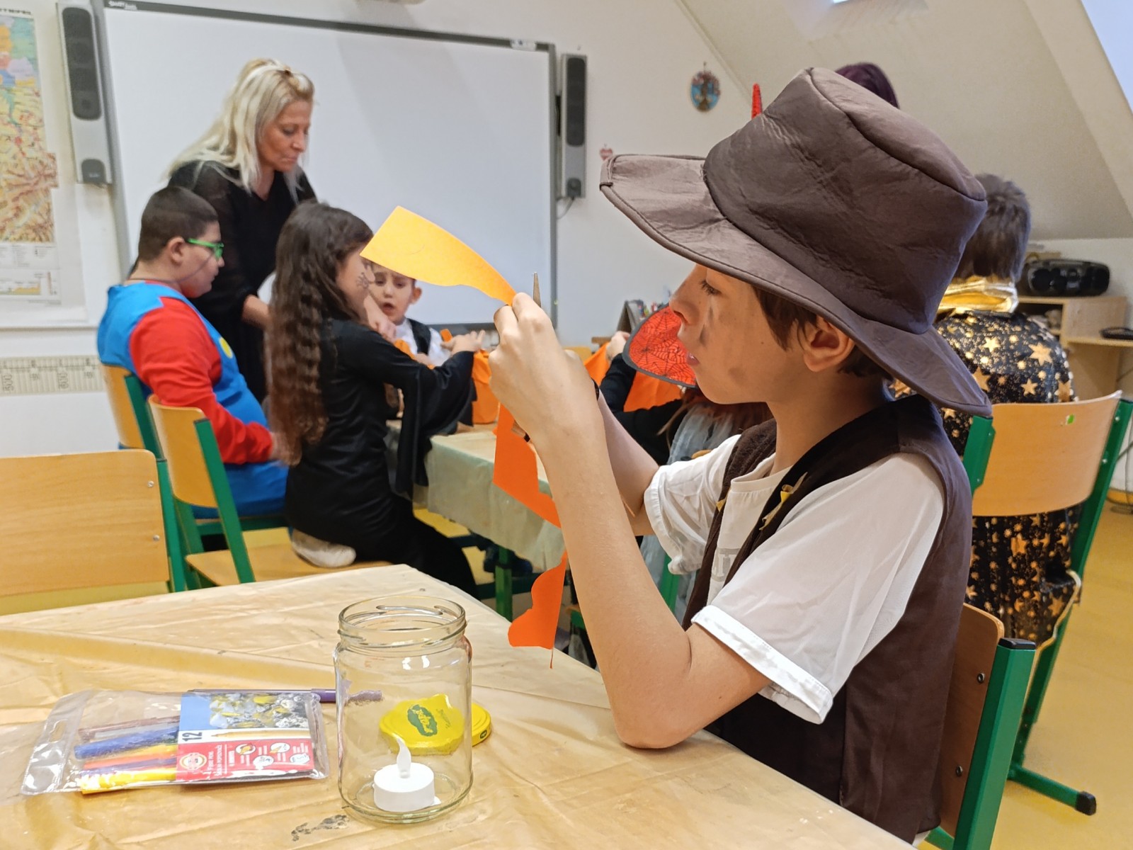 Na dalším stanovišti se pod vedením dvou paní učitelek pustily do výroby lucerniček. Děti se ponořily do tvoření s nadšením — vznikaly originální dekorace s motivy dýní.