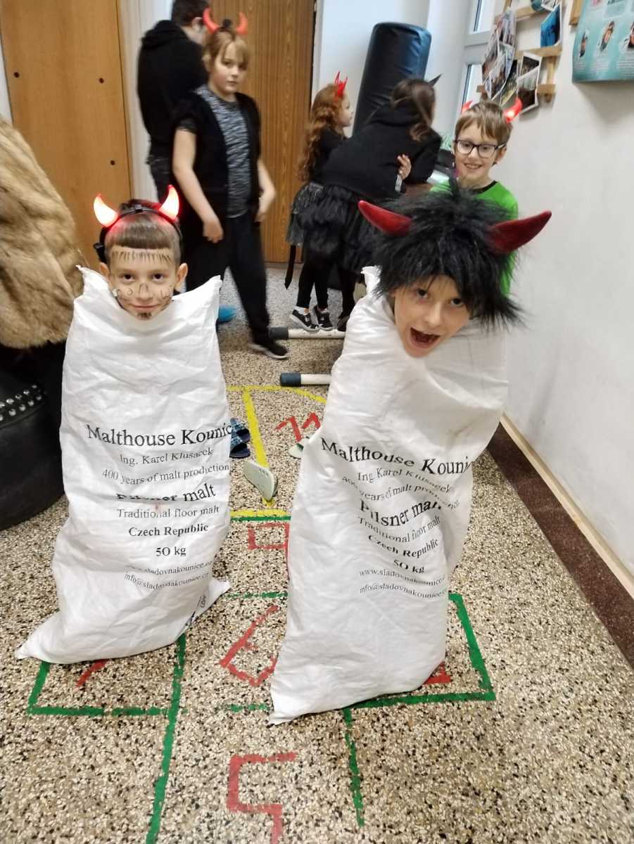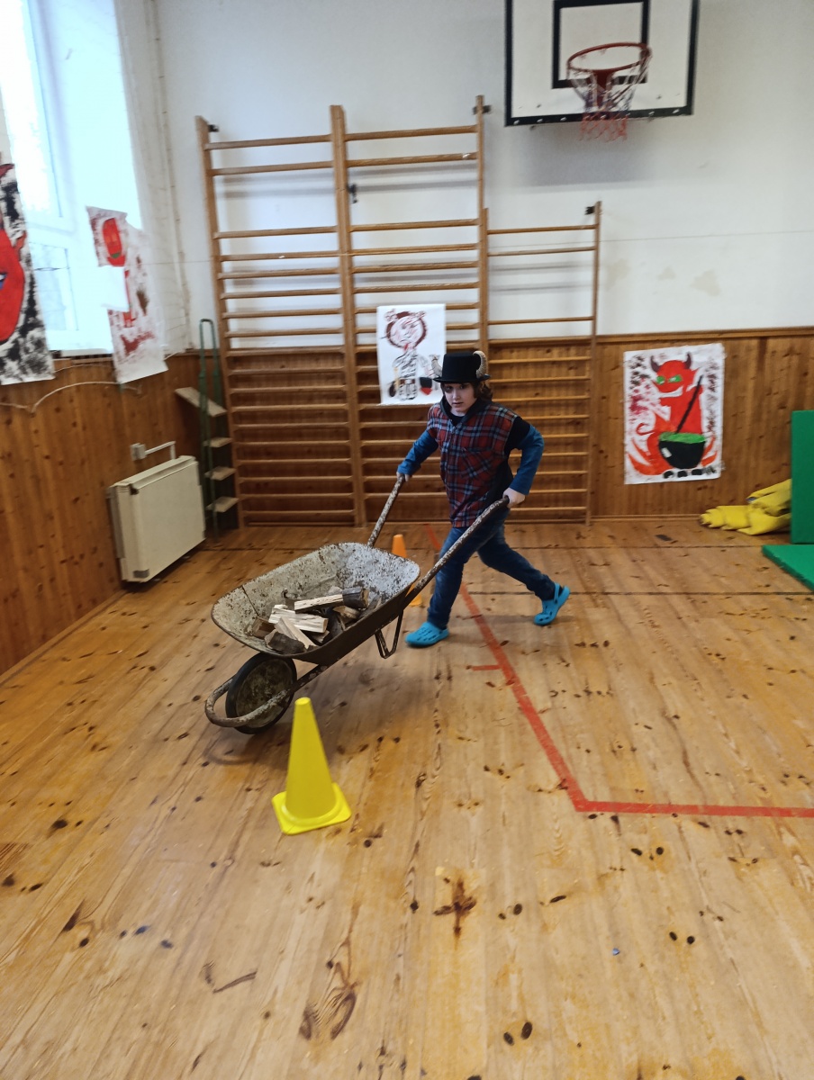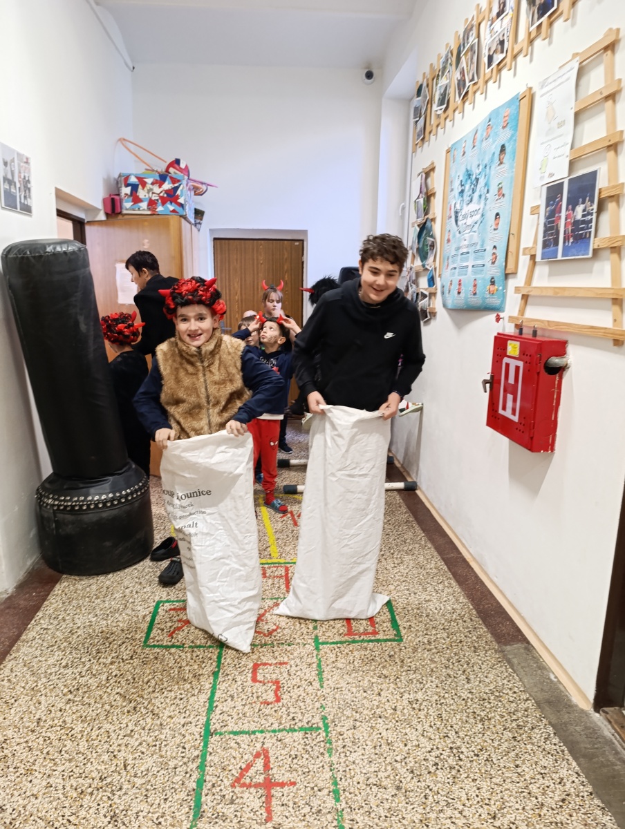 Dopoledne bylo naplněné hrami a soutěžemi. Děti vytvořily 5 skupin a plnily 5 úkolů - převoz dřeva na kolečku, hod do čertovského kotle, skákání v pytlích, naučení se čertovského tance nebo čertovské básničky. Nechyběla ani návštěva samotného Mikuláše. Za básničku nebo písničku odměnil děti sladkým balíčkem a pochvalou.