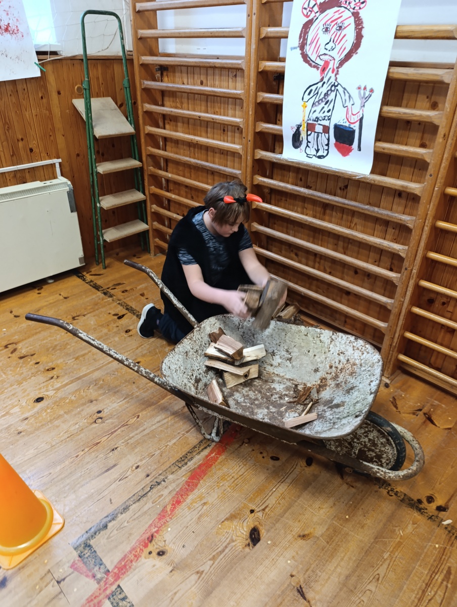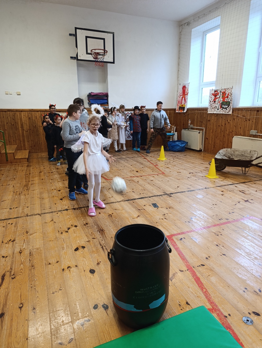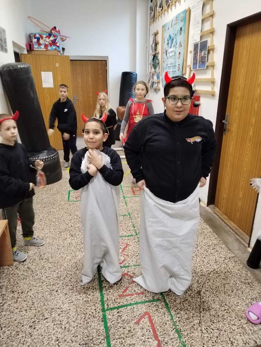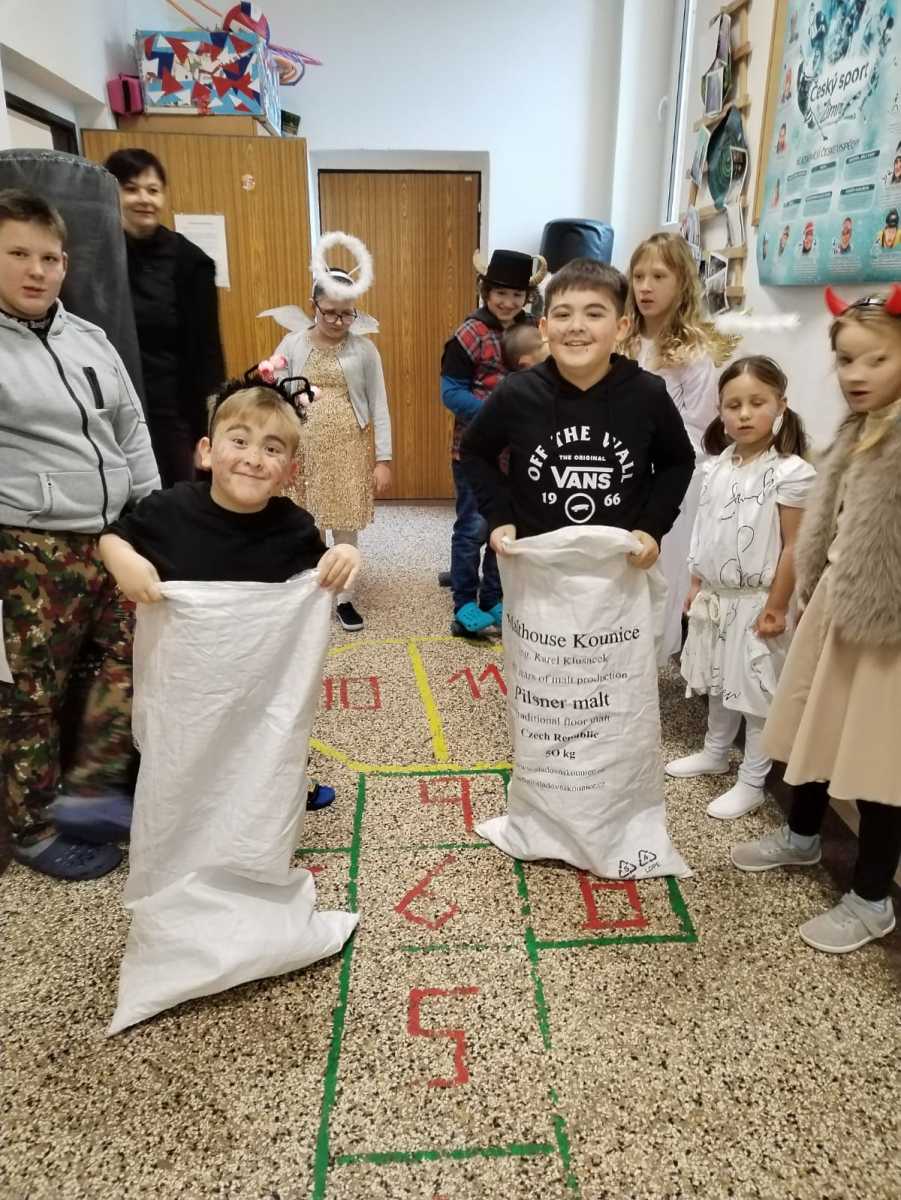 Dopoledne bylo naplněné hrami a soutěžemi. Děti vytvořily 5 skupin a plnily 5 úkolů - převoz dřeva na kolečku, hod do čertovského kotle, skákání v pytlích, naučení se čertovského tance nebo čertovské básničky. Nechyběla ani návštěva samotného Mikuláše. Za básničku nebo písničku odměnil děti sladkým balíčkem a pochvalou.
